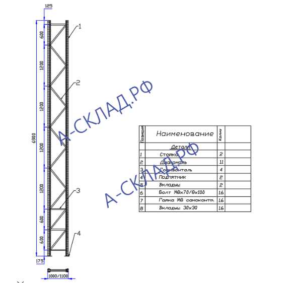 Рама П 90 6900×1000×1,5 мм для стеллажа серии П 90 старый зацеп. Основные параметры и размеры стеллажа соответствуют ТУ 525 472−001−3 459 454−17, ГОСТ Р 55 525−2017.