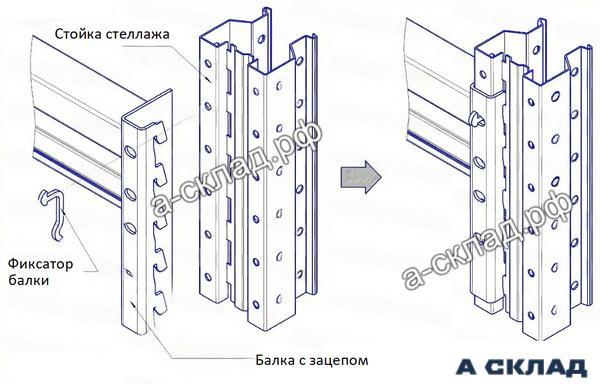 Схема установки балки В 2700 на стеллаж с фиксатором