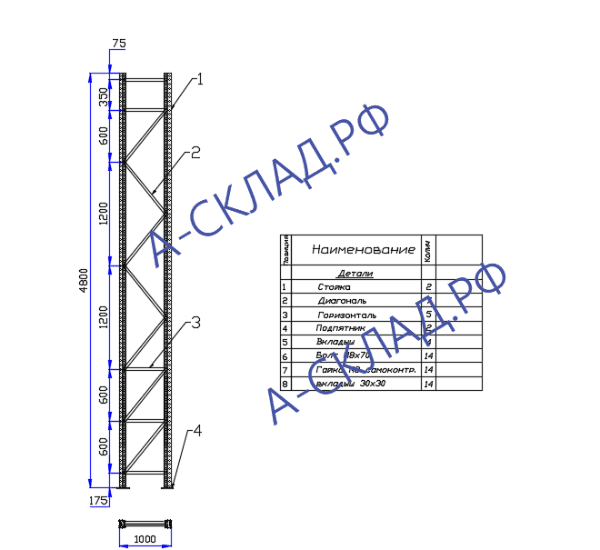 Рама П 90 4800×1000×1,5 мм для стеллажа серии П 90 старый зацеп. Основные параметры и размеры стеллажа соответствуют ТУ 525 472−001−3 459 454−17, ГОСТ Р 55 525−2017.